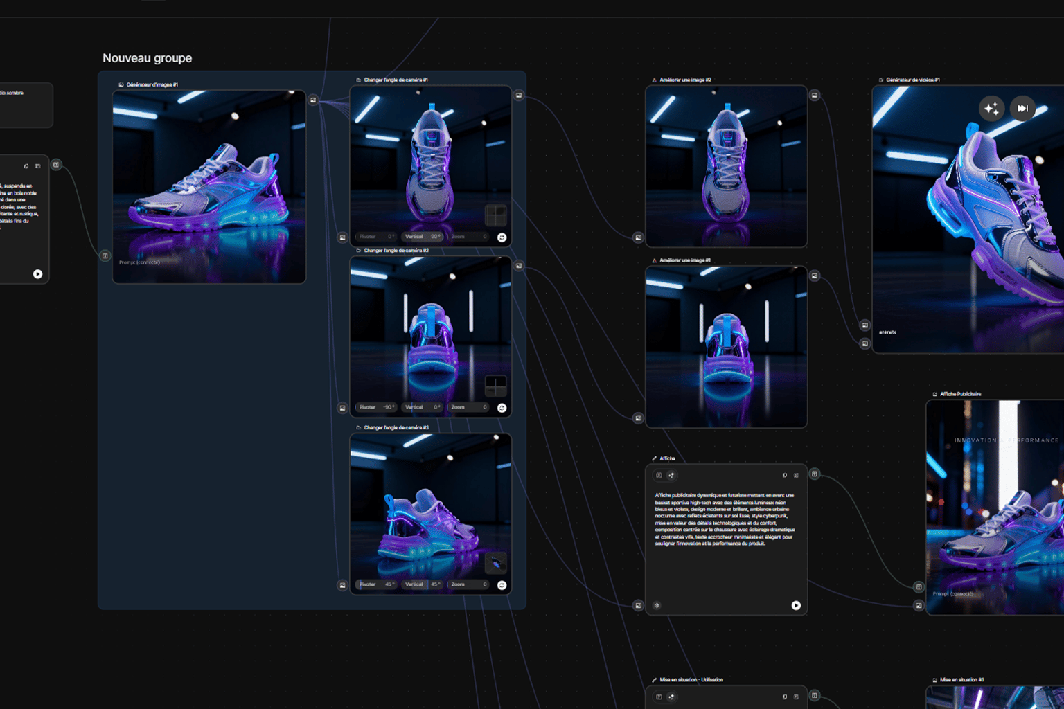 L'automatisation visuelle : Fini de répéter 10 fois les mêmes tâches. Vous créez votre "machine" une fois (ex: Générer une image -> La décliner en format Story -> Créer une variante vidéo -> Upscaler le tout), et elle tourne à l'infini pour chaque nouveau produit.
