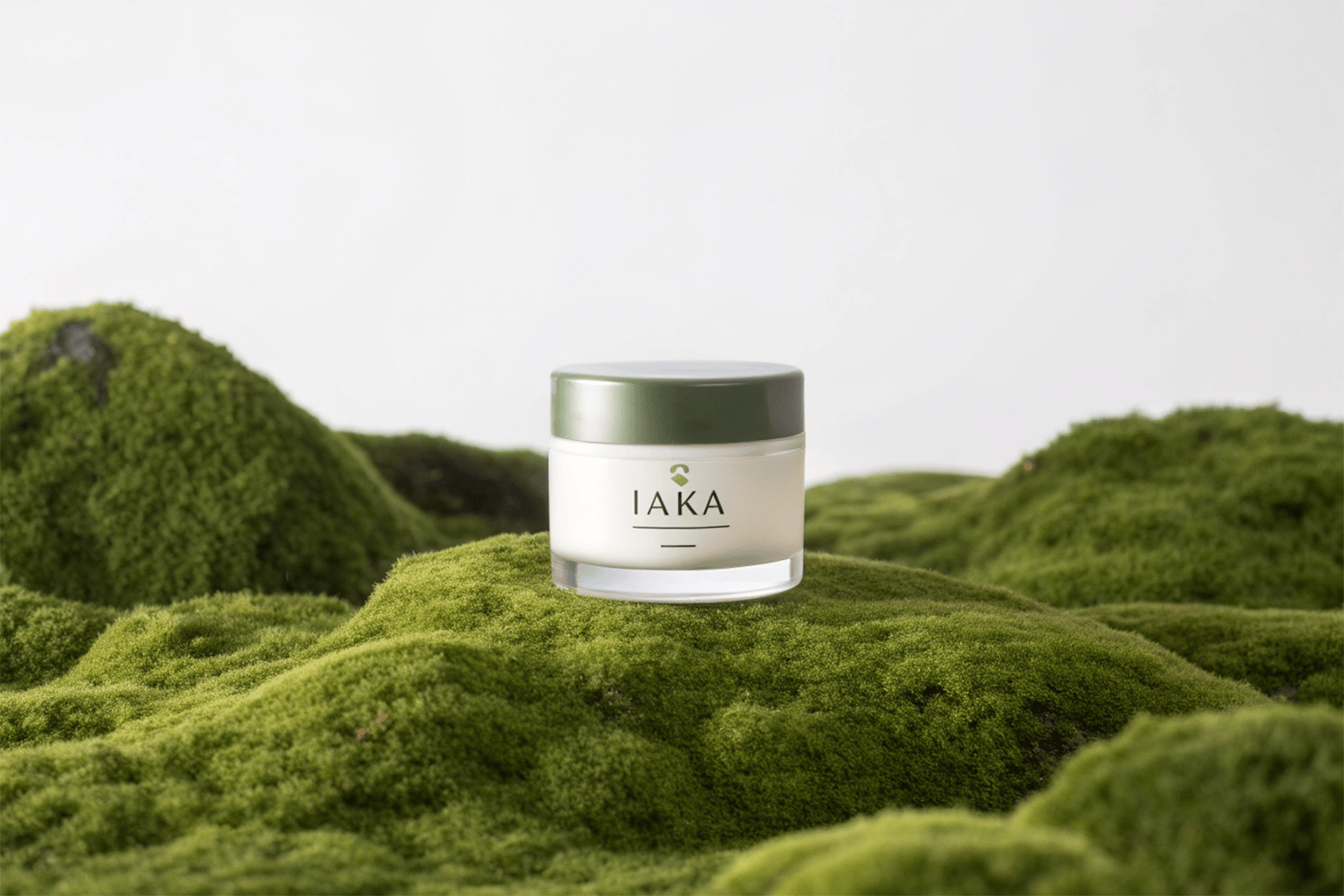 The brand name "IAka" is written on the jar of face cream, which stands on top. The whole composition lies in an abstract, mossy green landscape. this is a photo for an advertising campaign. It is a studio photo. the style is minimalism. This is a high-resolution photograph.
