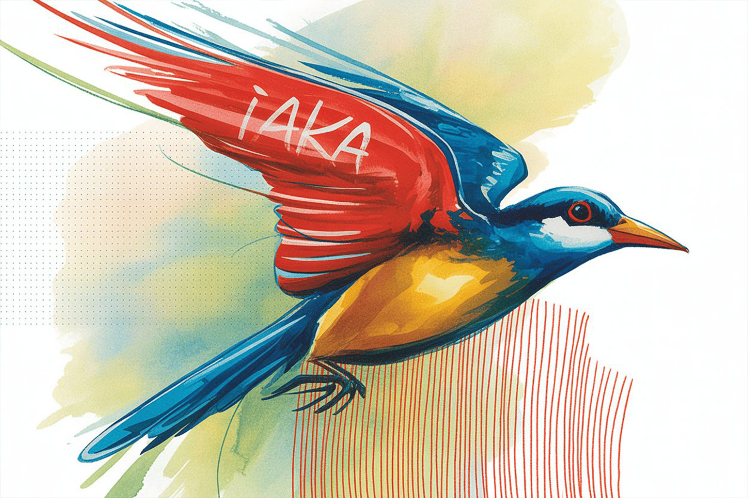 A vibrant watercolor illustration of a bird in flight against a textured background. The bird has a bright red wing spread wide, with detailed brush strokes showing texture and movement. The bird's body is colored in blue and yellow, with a distinctive black eye and sharp beak. The wingtip extends beyond the frame of the image. The background features a grid pattern in the upper left corner, with splashes of pale yellow and green watercolor washes. Red vertical lines run along the bottom portion of the background. The overall composition has a loose, artistic style with visible brush strokes and paint textures. The bird is positioned diagonally across the frame, flying from left to right. We can see the word "IAka" on the bird's wing. The illustration combines both precise detail in the bird's features with expressive, loose watercolor techniques in the background.