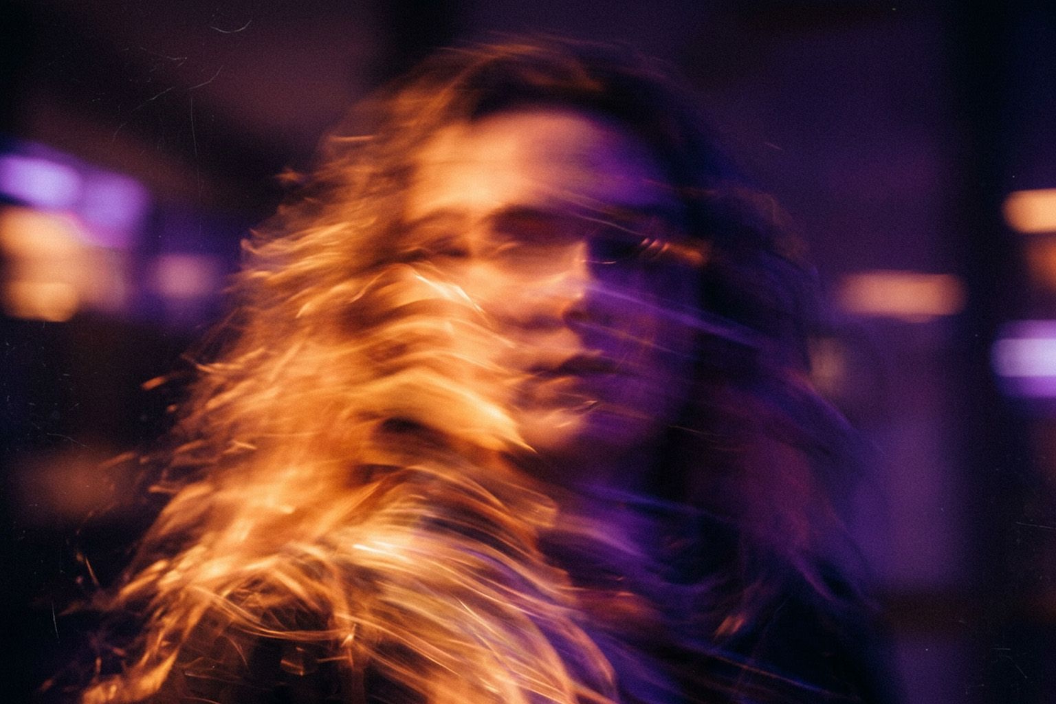 abstract analog portrait where the human face dissolves into streaks of light, no sharp facial features, heavy motion blur, warm orange and deep purple color fields, dreamlike and emotional, experimental cinema still, film grain, soft focus. camera: 35mm film camera,lens: 50mm f/1.4,settings: f/1.4, 1/8s, ISO 800,film stock: Cinestill 800T