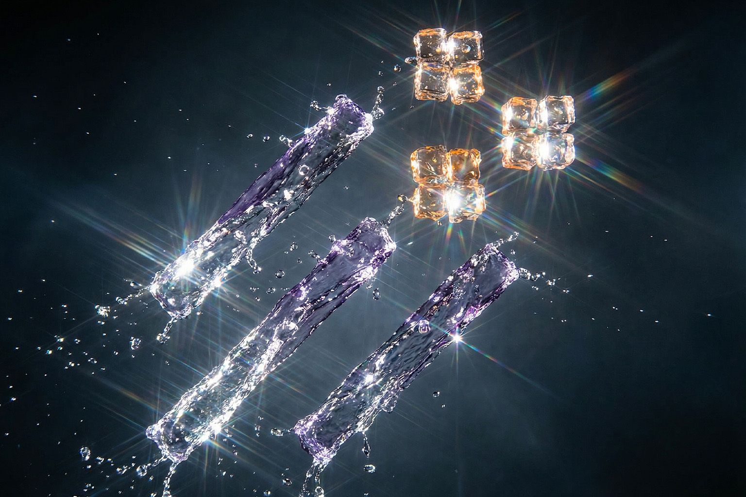 (Fournissez d'abord votre logo) - A dynamic, fresh logo sculpted from suspended water captured in high speed photography, with sharp, detailed droplets frozen in mid-air and light rays passing through the translucent liquid, creating sparkling highlights, soft refractions, and a dark background for a modern, energetic look.